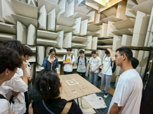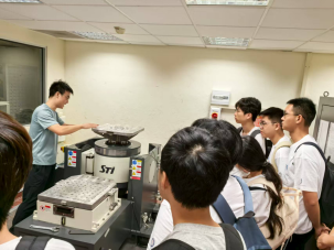 在新加坡国立大学设计与工程学院,大家在Lee Heow Pueh教授团队的李亚鹏老师、徐安雨博士的带领下,参观了振动与噪声实验室,老师们为同学们详细讲解了实验室内的实验设备及场所,包括振动检测仪、声波发生器、消音室、回响室等,并介绍了这些设备所进行的研究项目,如对材料阻振性能、吸声性能的测定、在消声室场景下或回响室场景下不同位置的音量测定等。通过这些讲解,同学们了解了工程学院的研究领域及方向,并对机械振动噪声的测试与应用有了更直观、更深入的理解与认知。