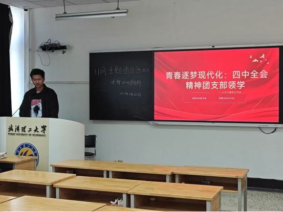 为深入学习贯彻党的二十届四中全会精神,进一步引导广大团员青年坚定理想信念,明确前进方向,11月20日上午11:30,道桥2404团支部于航海楼504教室召开了“青春逐梦现代化”主题团日活动。本次活动由团支书李博艺主持,道桥2404团支部全体成员参与。