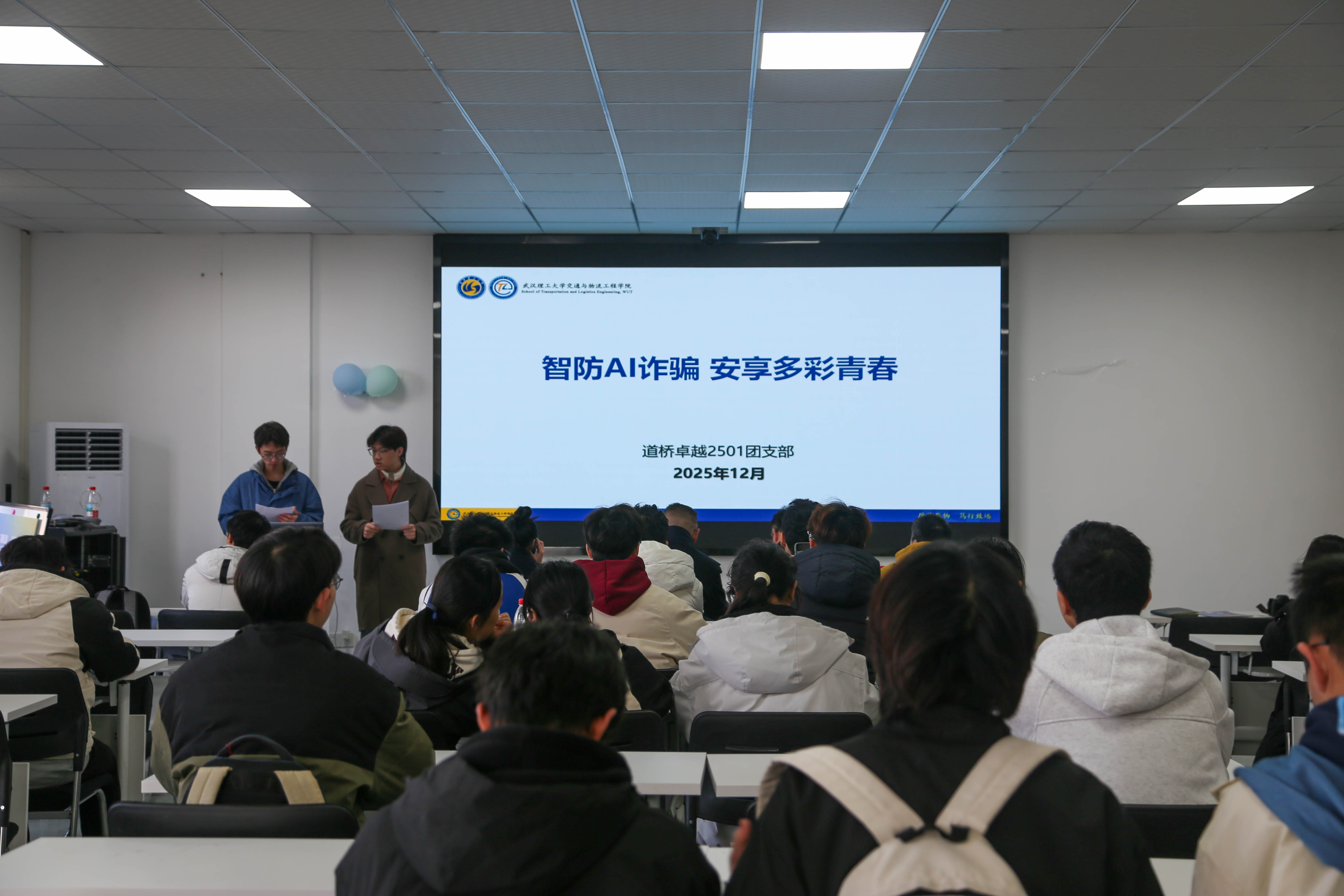 为提升青年学生应对AI诈骗的防范意识与实操能力,落实反诈宣传教育常态化要求,营造平安清朗的校园环境,12月25日下午,学院道桥卓越2501团支部举办“智防AI诈骗,安享多彩青春”反诈讲座。武昌区公安分局杨园街派出所副所长张贵江、一级警员武娅瑄,学校余区管委会副主任钱冰松、政保科科长闸洪受邀出席,2025级道桥和物流专业学生代表共同参与。
