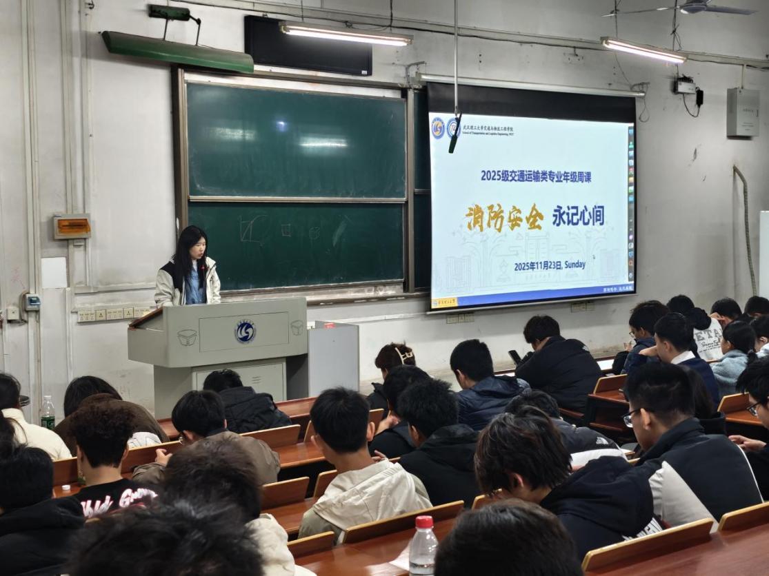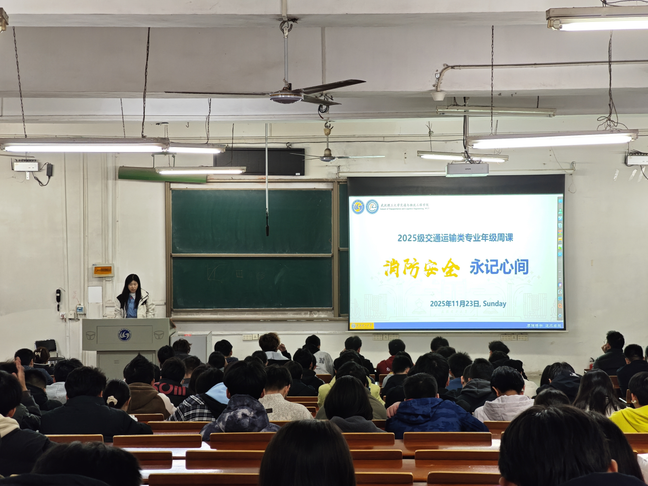 为增强新生消防安全意识,提升火灾防范与应急处置能力,筑牢校园安全防线,11月23日下午,2025级交通运输类专业、交运博学班以 ““消防安全,永记心间”消防安全,永记心间” 为主题的年级周课在东配楼 101教室顺利开展。本次周课由辅导员孙研老师主讲,全体同学参与学习,共同筑牢校园消防安全的 ““防火墙”防火墙”。