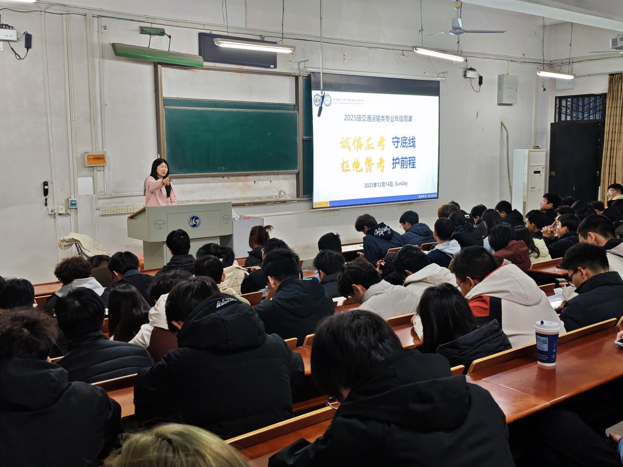 为切实增强新生安全防范意识,筑牢校园安全防线,同时强化学生考风考纪意识,树立诚信应考观念,2025年12月14日,2025级交通运输类专业、交运博学班以安全及纵欲和诚信考试为主题的年级周课在东配楼101教室顺利开展。本次周课由辅导员孙研老师主讲,全体同学参与学习。
